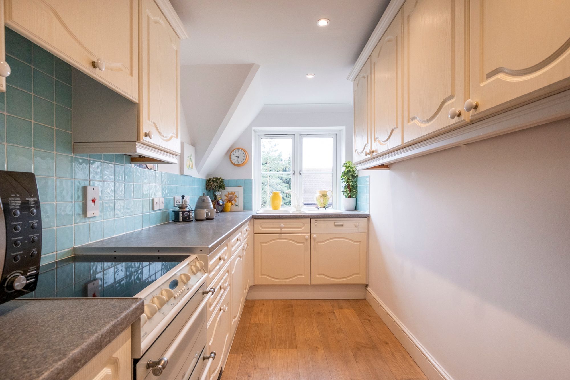 A Masterclass in Light and Layout The kitchen is a beautifully realised space, designed to be as inspiring as it is functional. Featuring a plethora of bespoke cabinetry finished in a soft off-white hue, the room feels welcoming These elegant units are perfectly grounded by warm wood-effect flooring, creating a harmonious blend of modern clean lines and organic textures. Fully equipped for the modern lifestyle, the space features a suite of essential appliances including a washing machine, freestanding oven, and fridge freezer, ensuring this "home from work" sanctuary is ready for culinary creativity from day one.