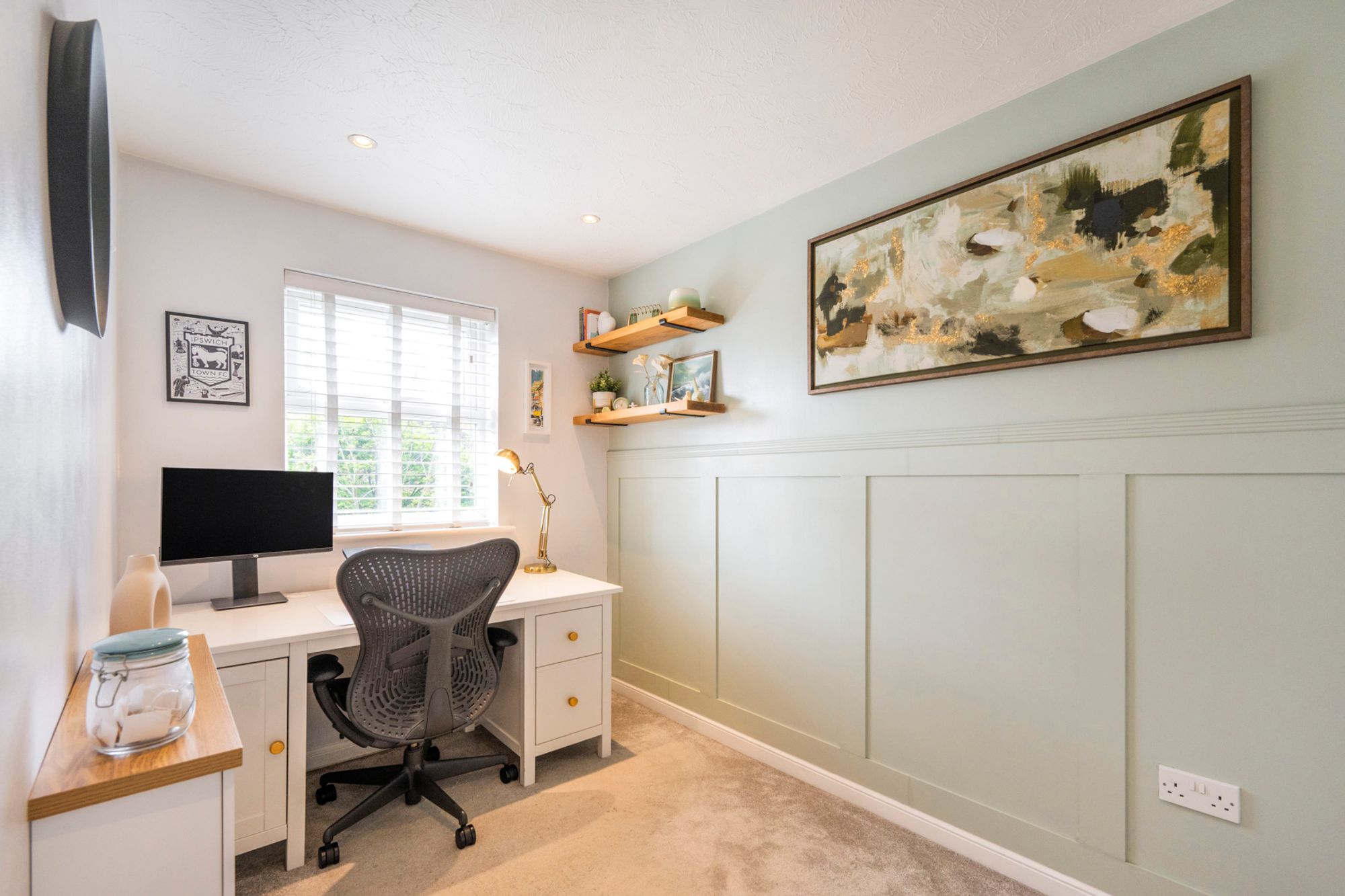 Currently utilised as a home office, this versatile room benefits from garden views and a light green panelled feature wall that brings a fresh, bright and stylish feel to the room.