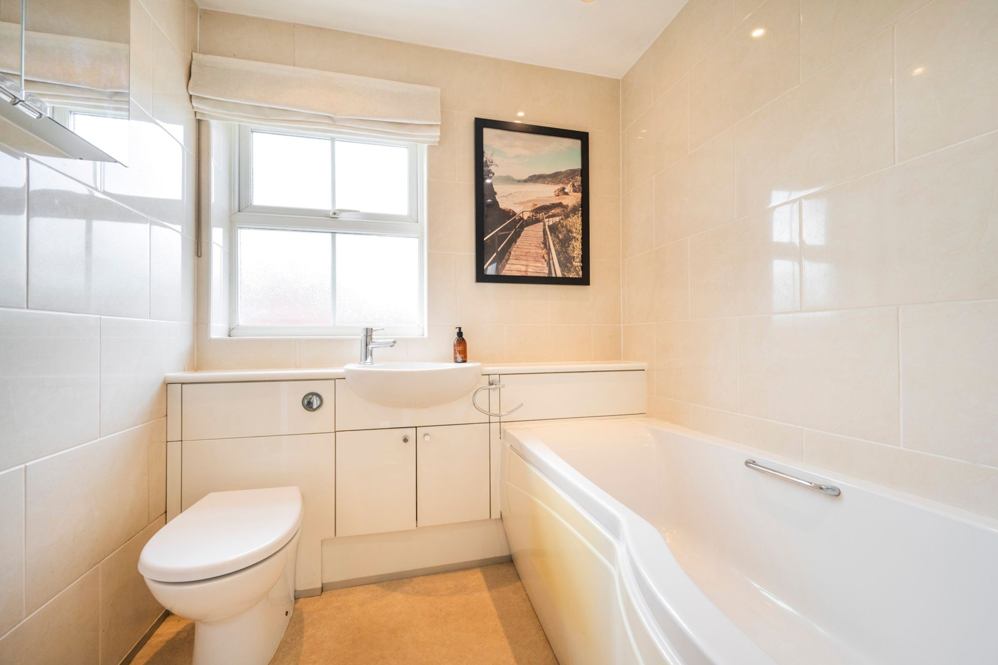 Finished in soft white and cream tones, the family bathroom offers a timeless and neutral backdrop—ideal for adding your own personal style. It features a P-shaped bath with shower over and fitted cabinetry, combining comfort with practical storage solutions.