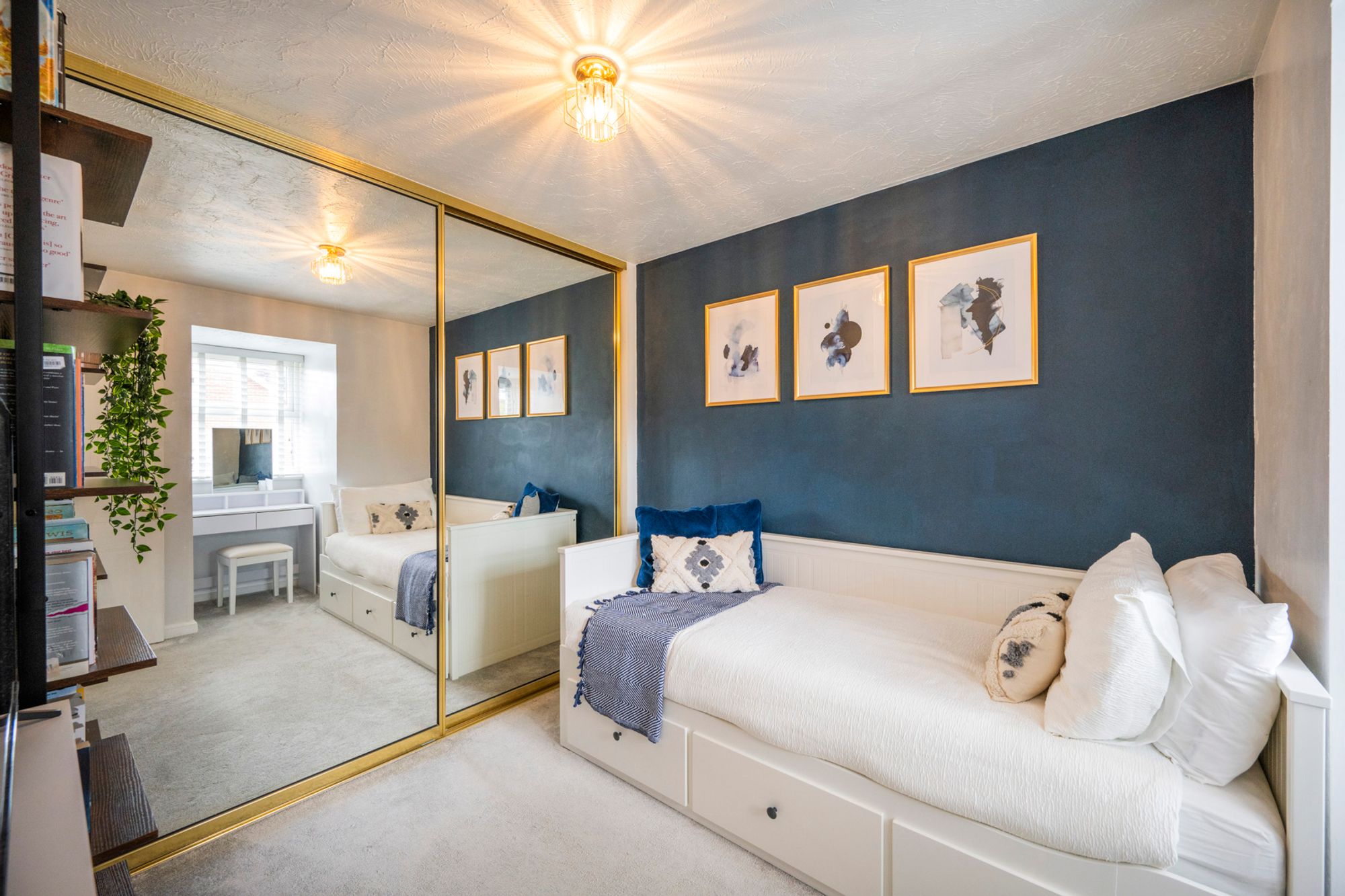 A well-proportioned double bedroom featuring built-in wardrobes with sliding mirrored doors, adding practicality and a sense of openness. A stylish blue feature wall brings character, while a useful window alcove provides the perfect spot for a dressing table or compact desk.