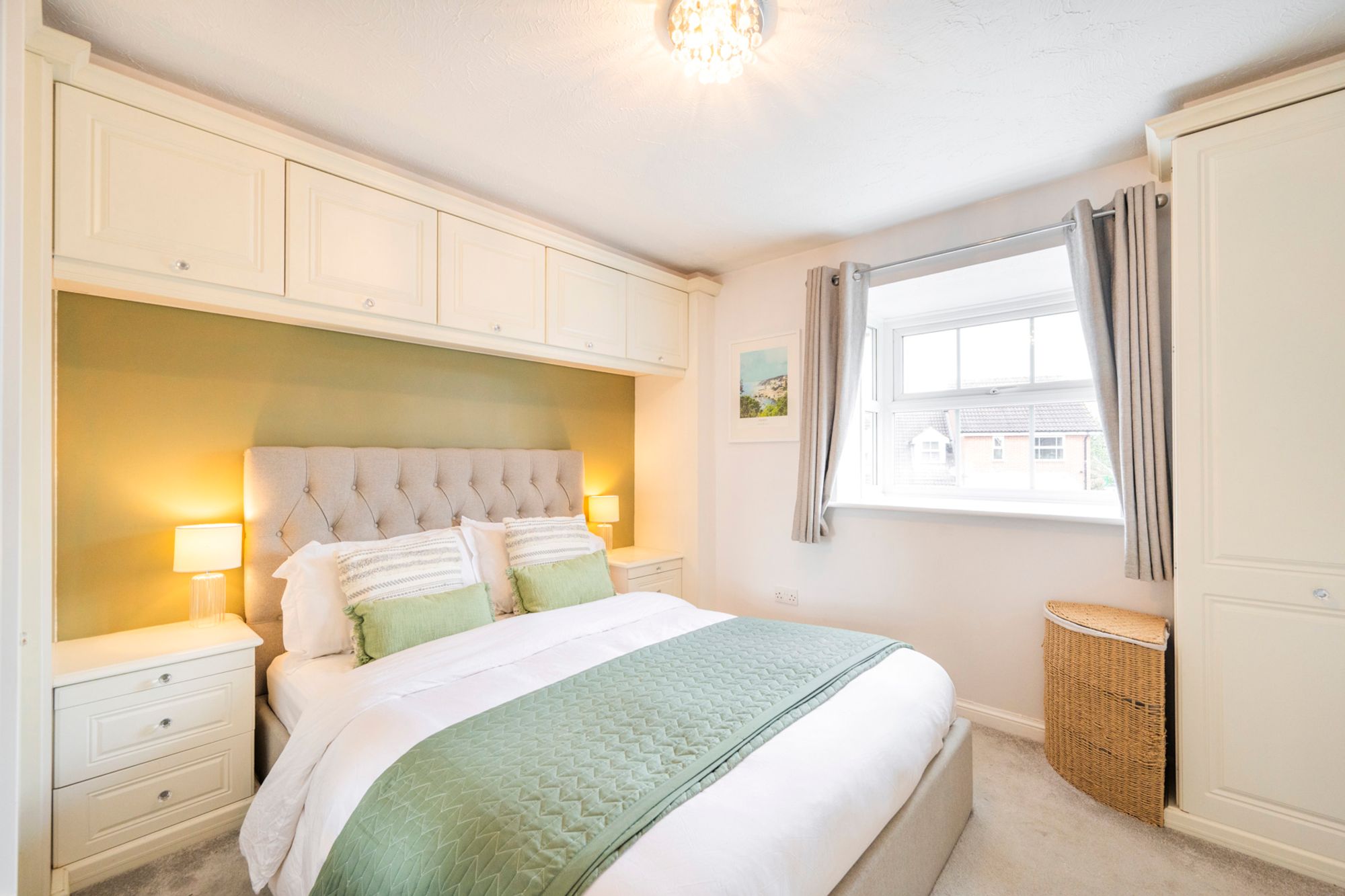 A beautifully arranged principal bedroom offering a calm and restful retreat, enhanced by soft olive green tones paired with crisp white décor. This traditional yet thoughtfully designed space maximises storage with an excellent range of integrated cabinetry, including bridging units and fitted wardrobes, as well as a double wardrobe. A charming square bay window adds character while allowing natural light to fill the room.