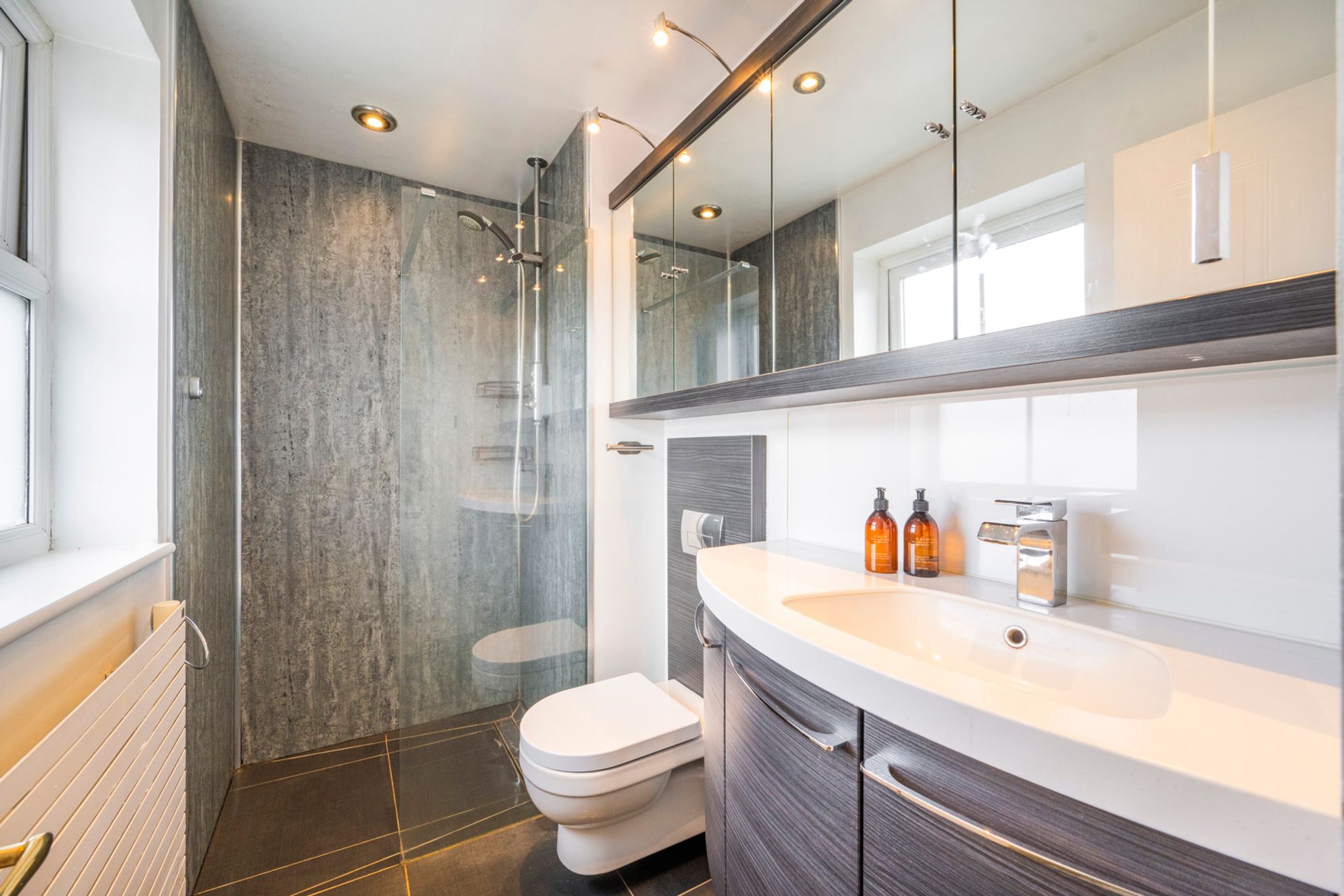 The adjoining wet room is finished in a striking monochrome style, featuring sleek matt black, grey and white tones for a sharp, contemporary feel. Complete with a double mirror cabinet and modern fittings, it provides a stylish and practical space—perfect for a refreshing start or end to the day.