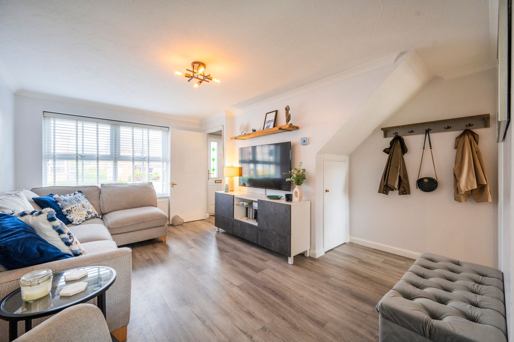 A welcoming and well-proportioned living space featuring stylish wood-effect flooring and a neutral white décor, creating a bright and versatile setting ready to personalise. An understairs cupboard provides practical storage, with additional hanging space for coats conveniently positioned by the kitchen door. A large window to the front floods the room with natural light.