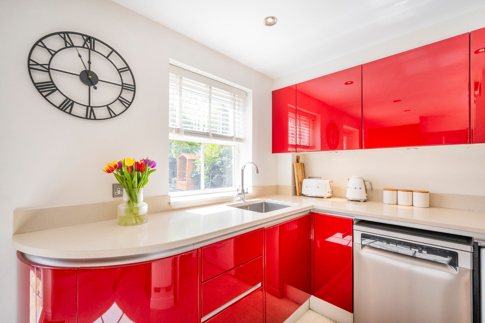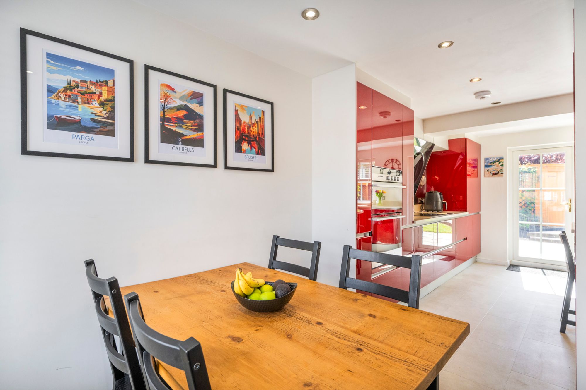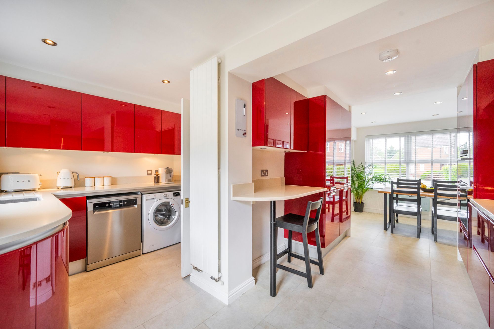 A striking, contemporary kitchen designed to impress, featuring a bold red, black and white colour palette that creates a vibrant, high-energy space at the heart of the home. Perfect for both entertaining and everyday family life, this modern showstopper offers an impressive double oven, stylish extractor, and an inset sink positioned to enjoy views over the garden. A breakfast bar provides a relaxed spot to sit and unwind while cooking, making it an ideal social hub—perfect for everything from a quiet glass of wine to lively family baking moments. Thoughtfully arranged worktops wrap around the room, leading to a glazed rear door that fills the space with natural light, enhancing its bright and welcoming feel.