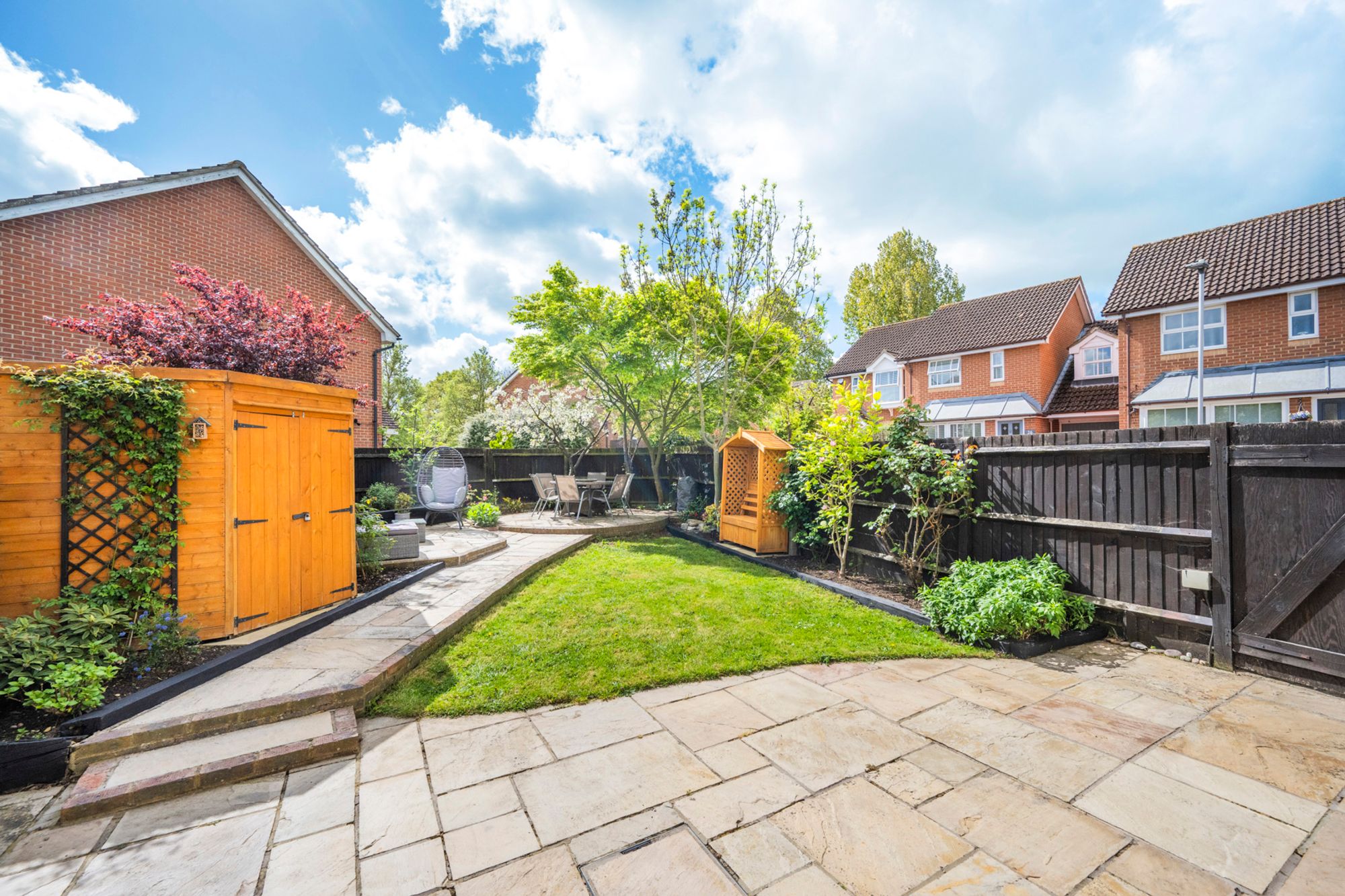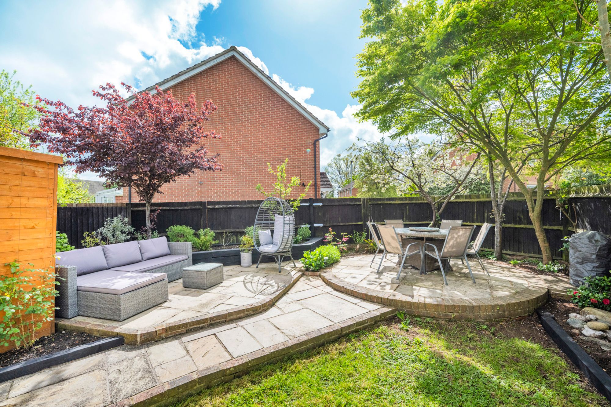 The landscaped rear garden offers a wonderful outdoor retreat, enjoying a southerly aspect that provides a bright and sunny setting throughout the day. It features a well-maintained lawn and an attractive patio area—perfect for al fresco dining and entertaining. A pathway leads to a second terrace, creating additional seating space, while mature shrubs set within planted beds add colour and privacy. The garden’s position enhances its sense of space, with a charming circular plateau area and a dappled tree providing natural shade to the upper terrace. A useful side shed offers storage for garden furniture, cushions and umbrellas, and side gate access adds further convenience.