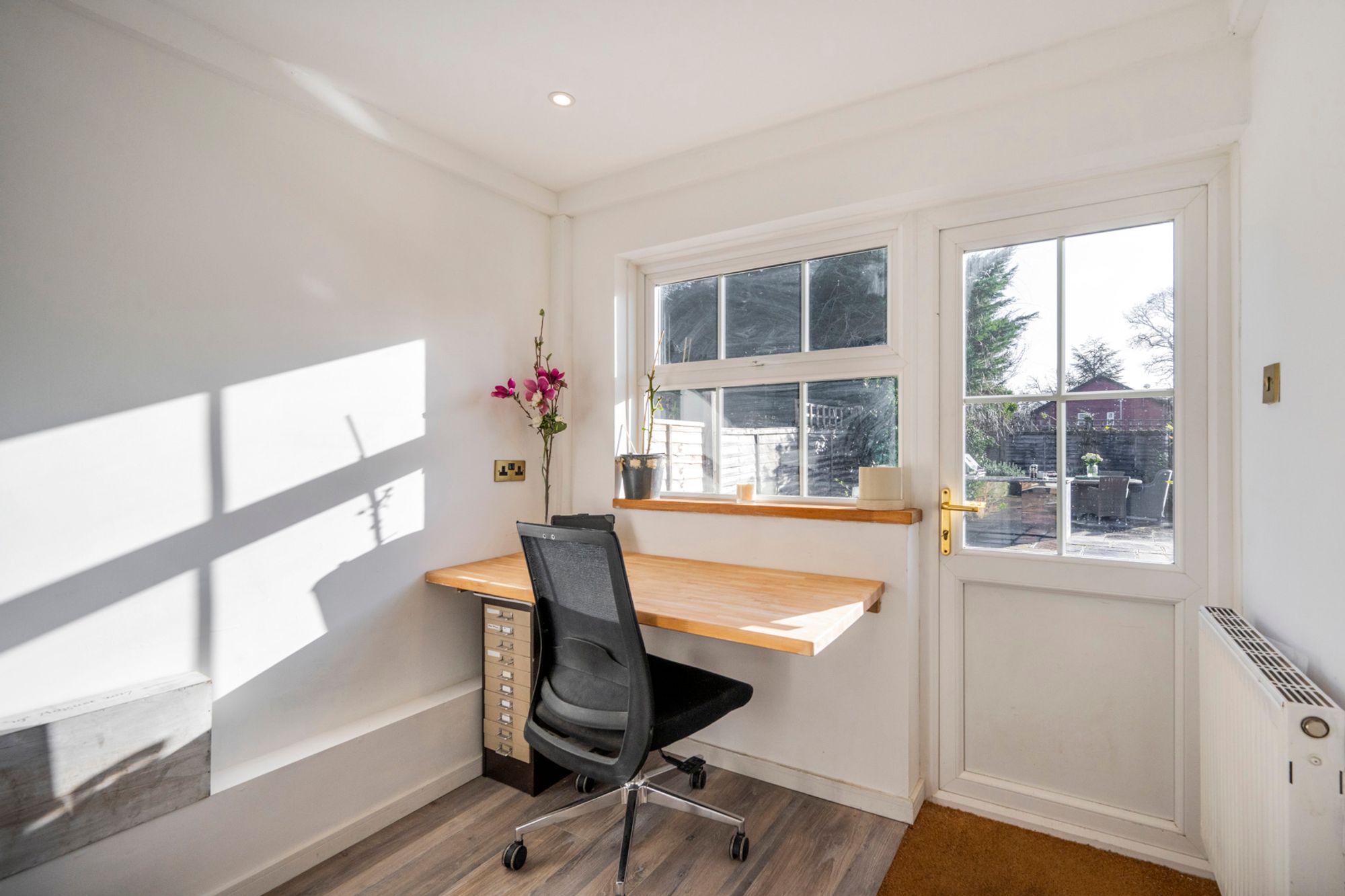 Bedroom Four is currently utilised as a professional home office, finished in a warm, inviting butter-cream palette with sleek wood-effect flooring. Its proportions make it equally suited as a dressing room, nursery, or single bedroom.