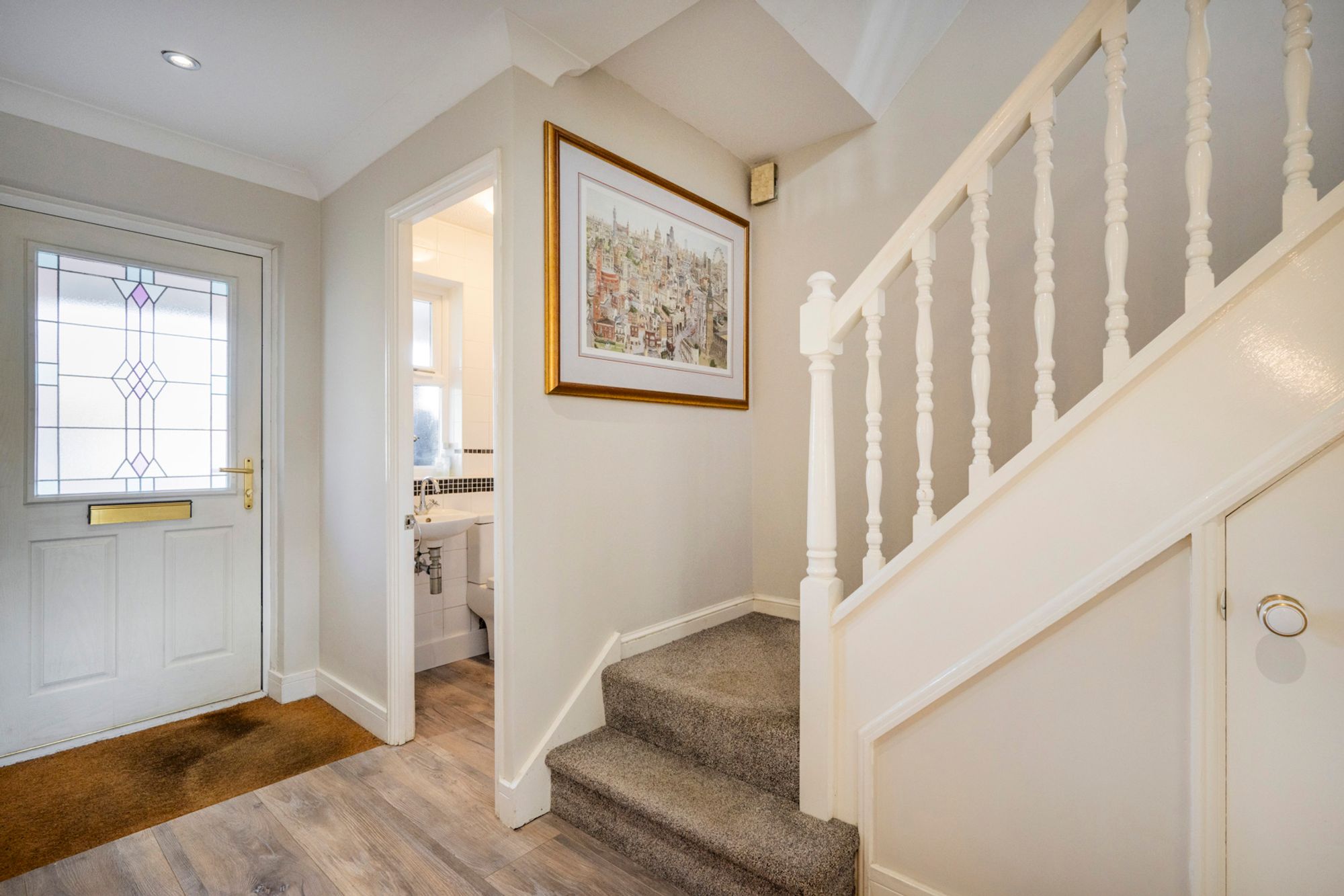 Step through the striking stained-glass entrance into a hallway that sets an impeccable tone; warm wood-effect flooring sweeps underfoot, leading past a sharp, monochrome guest cloakroom and discreet understairs storage. It is an entrance that feels both prestigious and welcoming, designed to handle the coming and going of a busy household with ease.