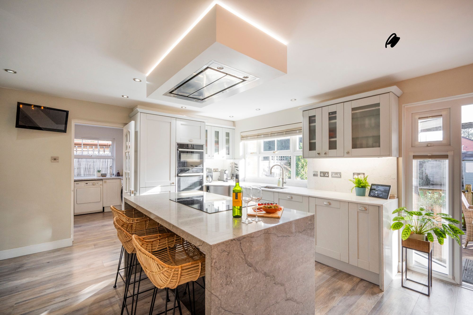 The true "wow" comes from the architecture of the light. A large picture window above the sink offers tranquil garden views, while the double patio doors—featuring integrated privacy blinds—dissolve the boundary between indoors and out. This layout effectively turns the covered outdoor patio into a seamless extension of the dedicated dining area. Whether it’s the discreet LED mood lighting glowing beneath the units or the space for statement designer pendants, every detail has been curated to impress.