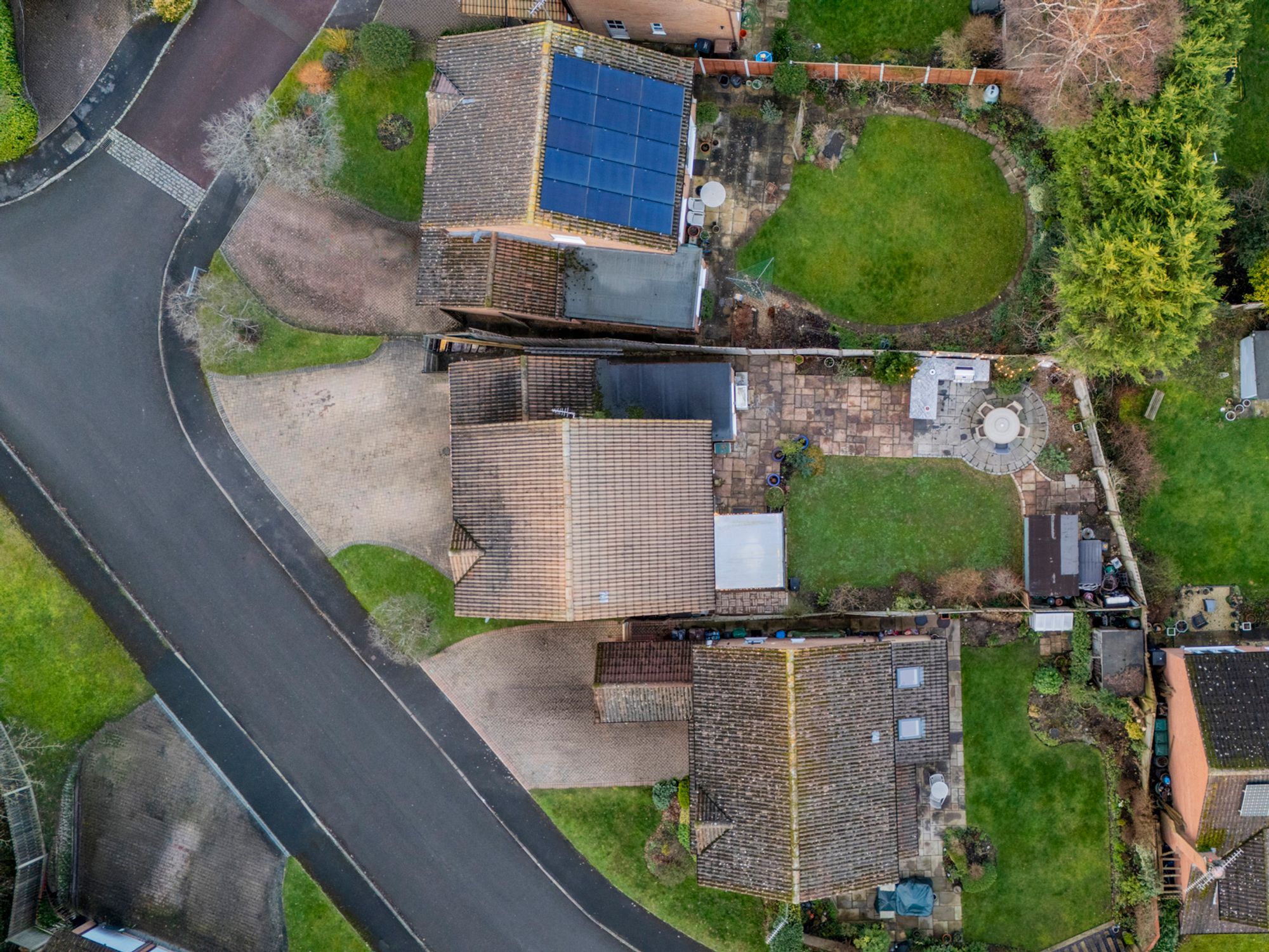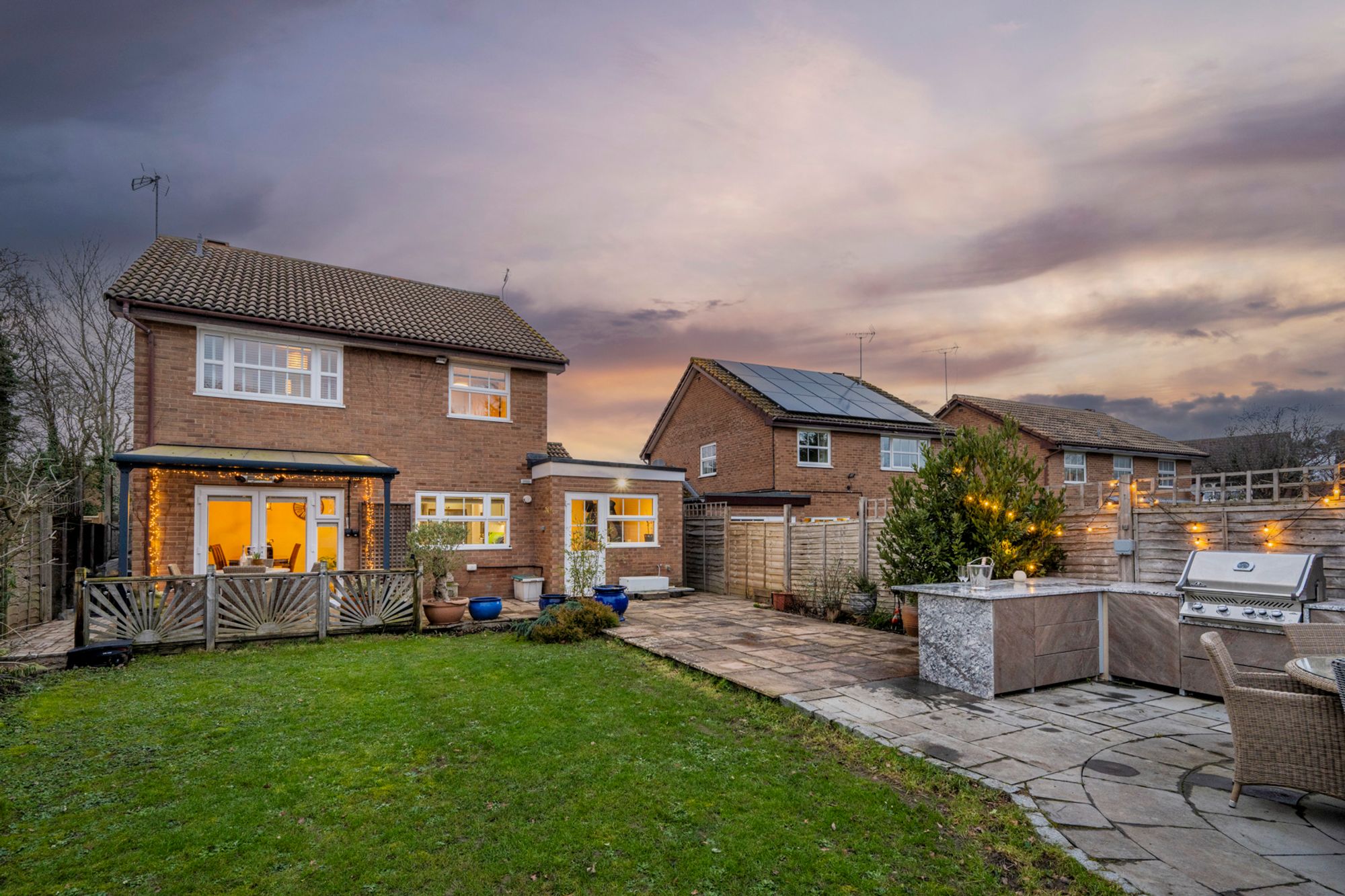 The garden is a masterclass in outdoor living, anchored by extensive Cotswold-effect stone patios. The covered dining terrace—complete with an integrated patio heater to effortlessly extend soirees into the evening—acts as a seamless all-weather extension of the home. The stonework leads to a dedicated outdoor kitchen zone, featuring a space for a prime BBQ station and professionally installed power sockets for easy installation. Oriented to follow the sun’s journey, the rays rise over the BBQ area and set over the al fresco dining section, ensuring this prestigious retreat is bathed in light from dawn until dusk.