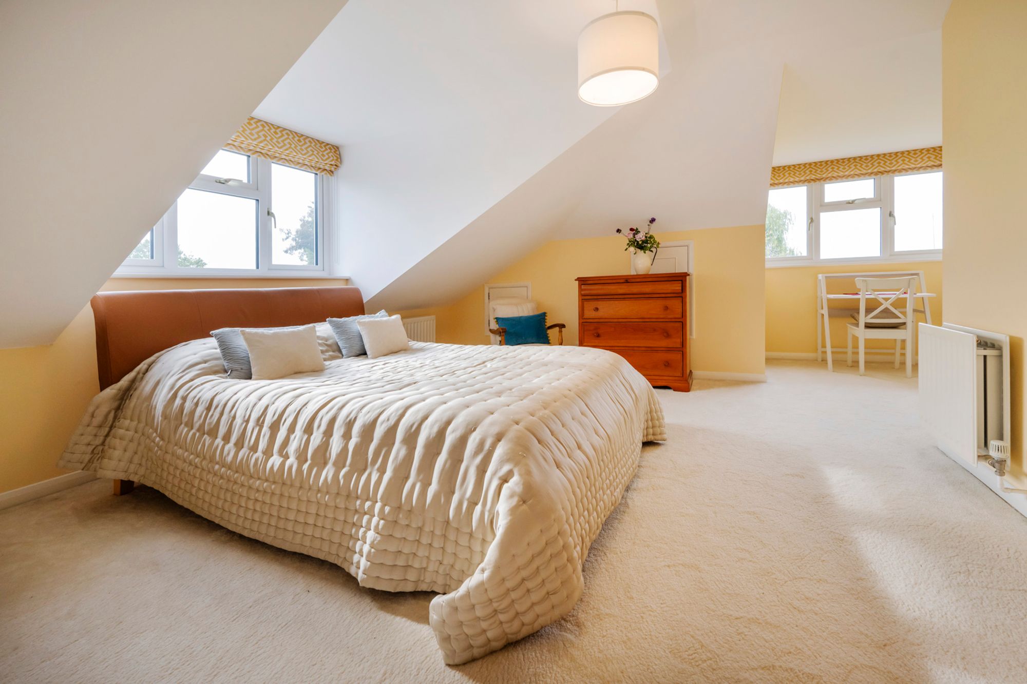 At the front of the property, a versatile second ground-floor room is currently used as a bedroom but could equally serve as a home office or study. A burnt orange feature wall gives warmth and character, while a plush carpet underfoot and views over the driveway and surrounding greenery ensure it remains both practical and charming.