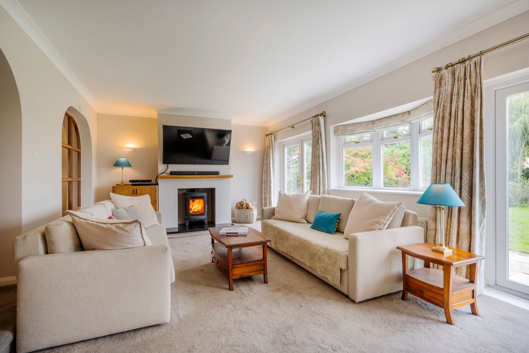 The main sitting room is a light-filled, welcoming space with a sense of occasion. A graceful archway frames the entry, while a bay window and two sets of double doors open directly onto the patio and gardens beyond. At its heart, a real wood burner, inset with a timber mantel shelf and black hearth, promises cosy evenings by the fire. With its generous proportions, the room easily accommodates large sofas and elegant side furniture, offering the perfect setting for both relaxed family evenings and sophisticated entertaining. The views from this room are spectacular.